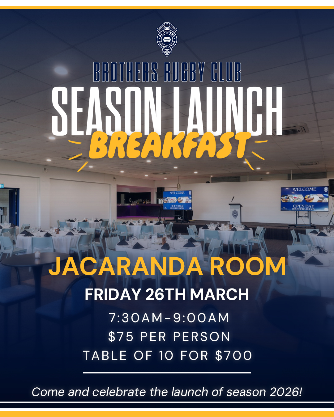 Join us as we officially kick off the season at the Brothers Rugby Club Season Launch Breakfast! Hosted by renowned rugby commentator Andrew Swain, the morning will set the tone for an exciting year ahead at Brothers. Hear directly from our Premier Grade Head Coach as he shares insights into the squad, the preseason and the vision for 2026, before we proudly unveil the Round 1 team. It’s a great opportunity for players, members and supporters to come together, reconnect and build momentum for the season ahead. Don’t miss it! Head to the link below for further event detailshttps://old.brothersrugby.com/events/season-launch-breakfast/