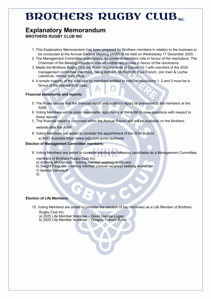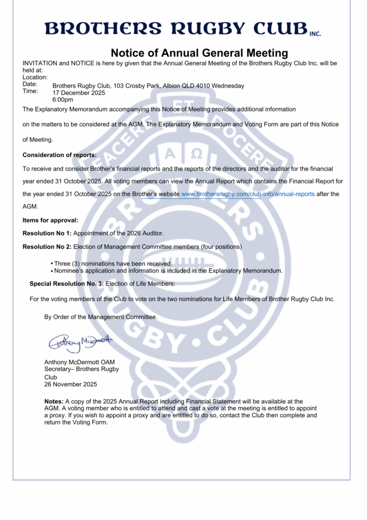 Brothers Rugby Club – Notice of AGM (2025)